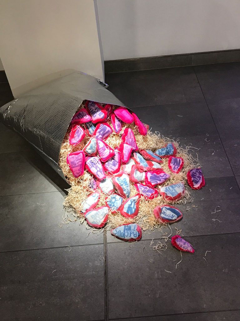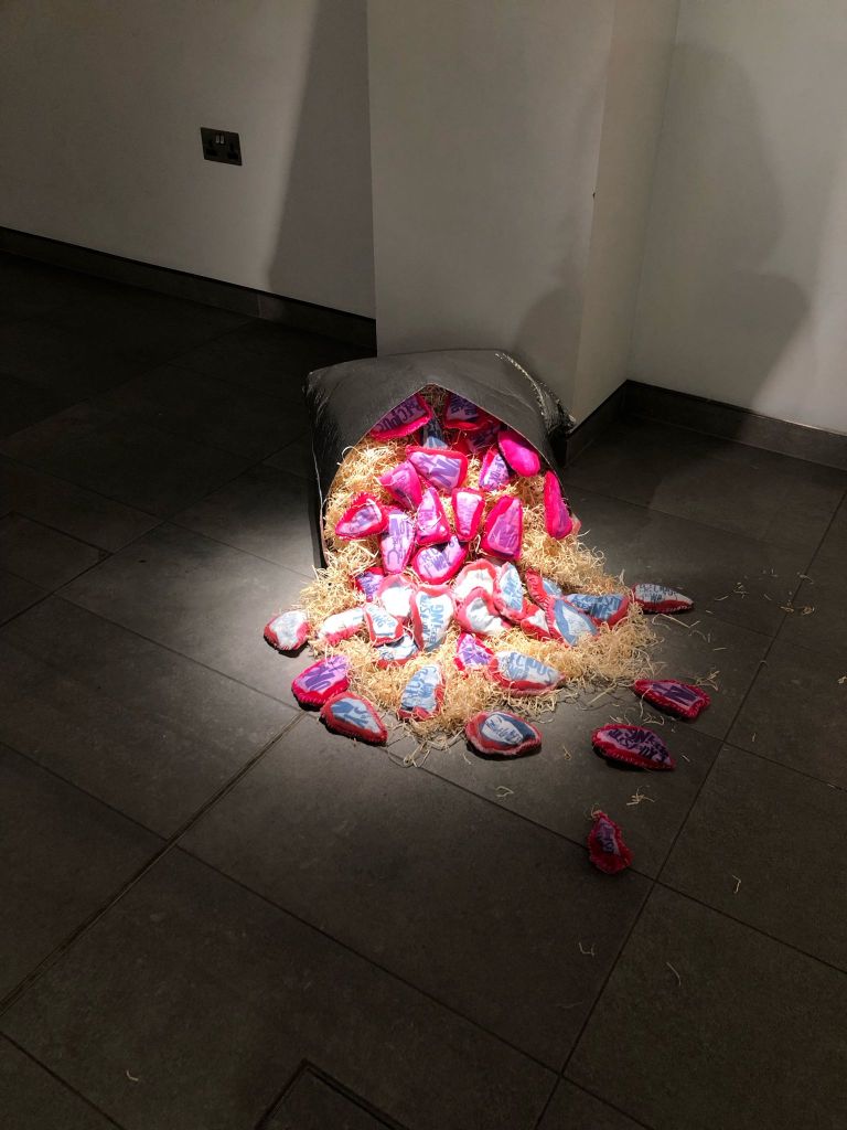 ‘Seed Comfort’ Hannah Bailey; fabric, thread, cyanotype, rice, dried grass, metallic bubble packaging; 2024
