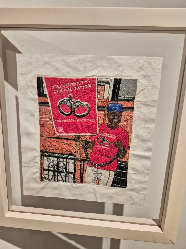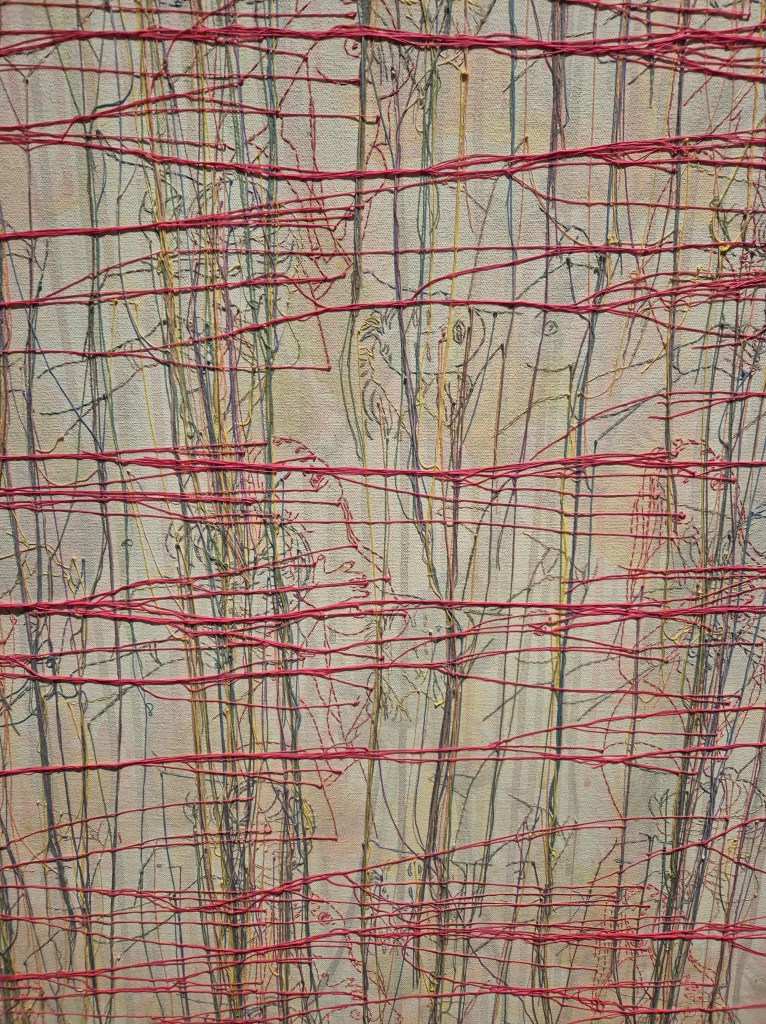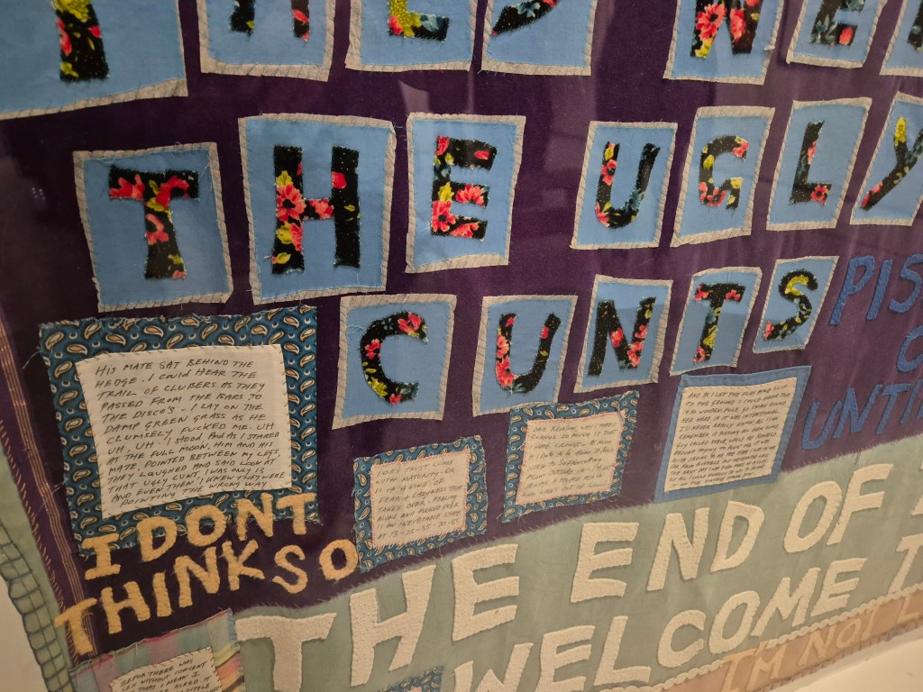 The first of the pieces (Ghada Amer, Pink Landscapes, 2007) below uses sewn outlines of the naked female form that you can only see up close. Tracey Emin’s quilt has bold, unfeminine, unflinching language – it is shocking and brave. Angela Su’s Sewing Together My Split Mind (2020) uses human hair. I had a very visceral reaction to this – it is so beautiful but also extremely repulsive, and I am in awe of the time it must have taken to construct.