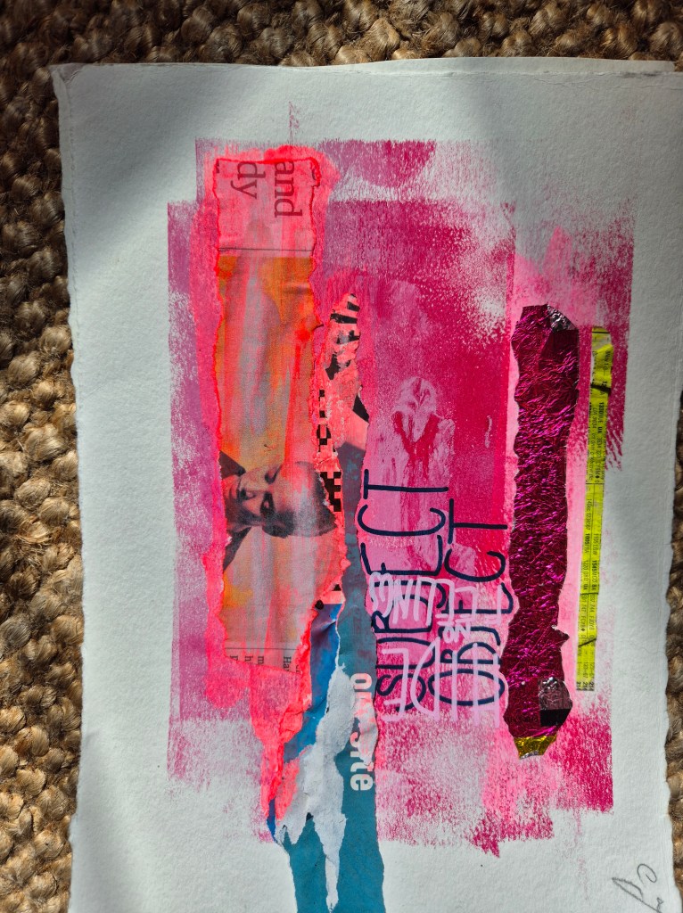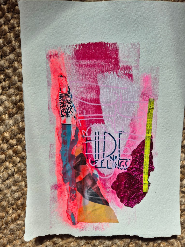 Trialling some mixed media – this uses acrylic paint, found posters, easter egg wrapping, fluoro ink and posca pens. The words say ‘SUBJECT OBJECT’ and ‘HIDE NO FEELINGS’. The writing wasn’t planned – I wrote what came to mind. I like how the words are constrained by the collage – like a tucked away secret.