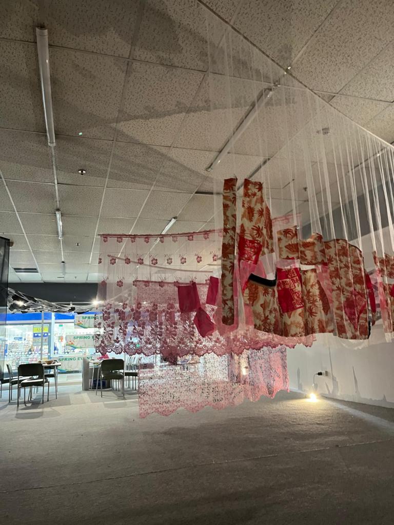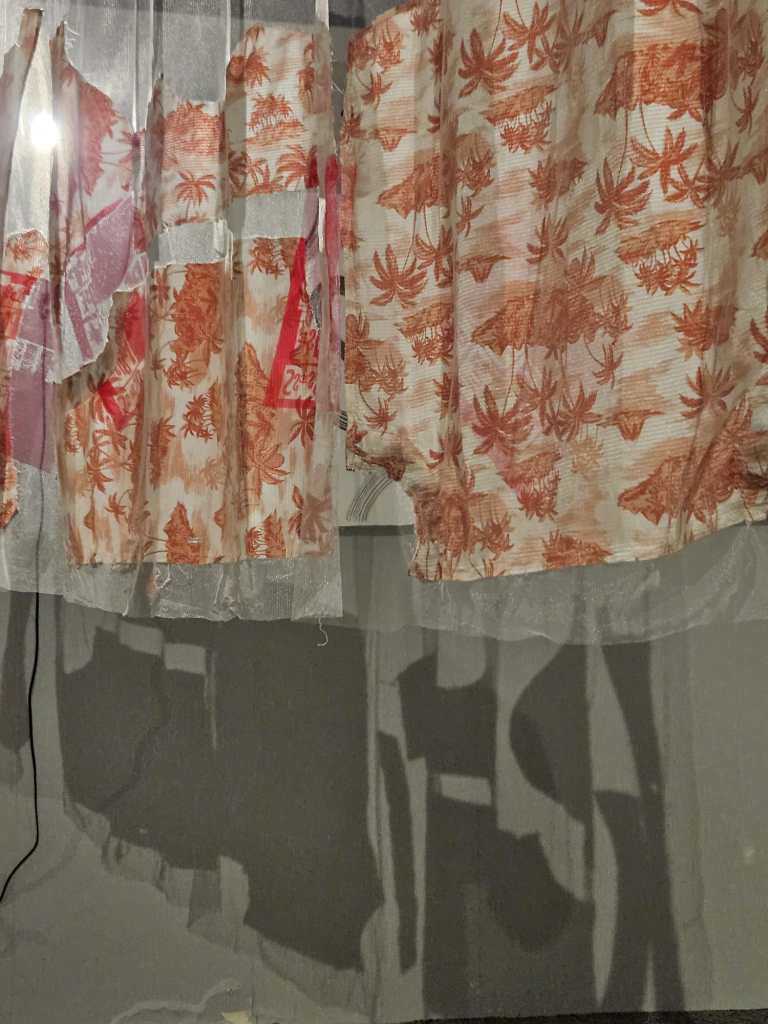 A key learning here was that I would have liked to hang this piece differently. It is large in scale, with each curtain around 3m, and the straight dowels used made them seem a little flat, and the overlaps – where I think things got most visually interesting – didnt happen as much as I would have liked. Next time I would like to make a bended rod or pole of some sort, so that the curtains are hung along a zig-zag and that way each curtain could be hung closer to each other. I would also like more directed lighting, which wasn’t possible with this venue.
