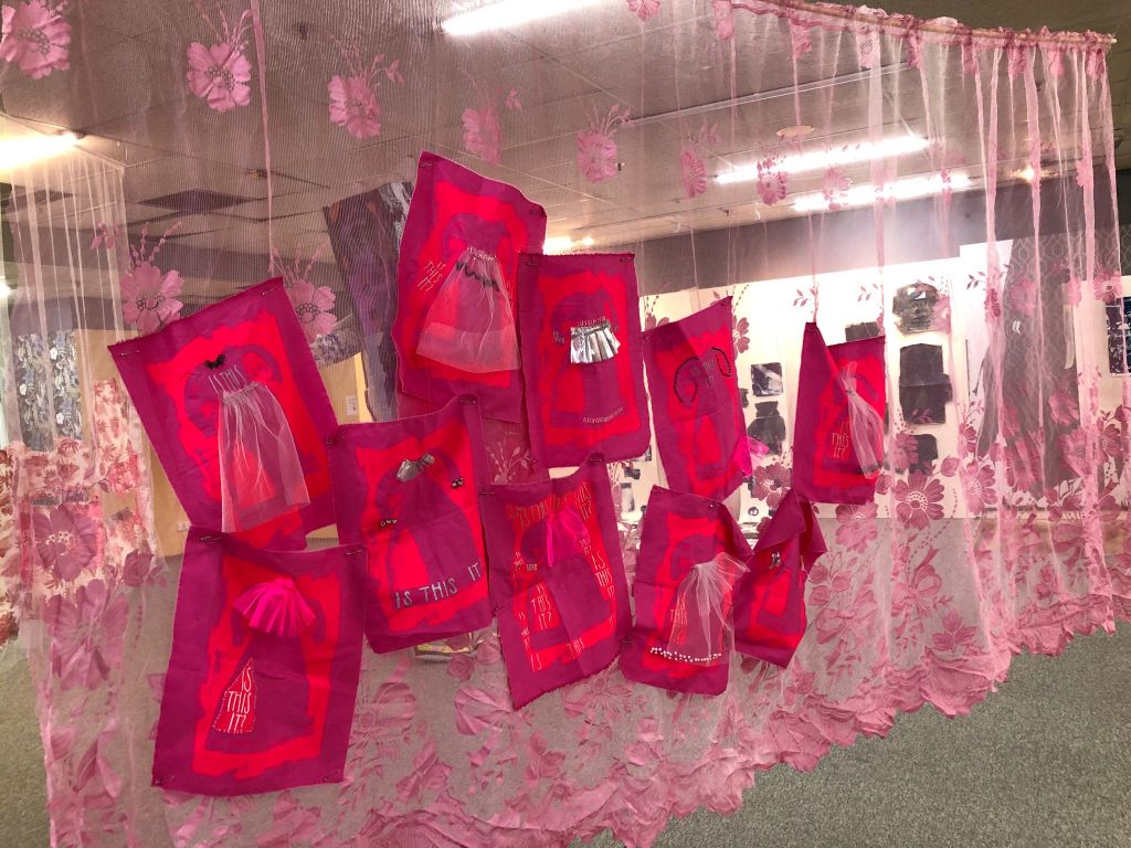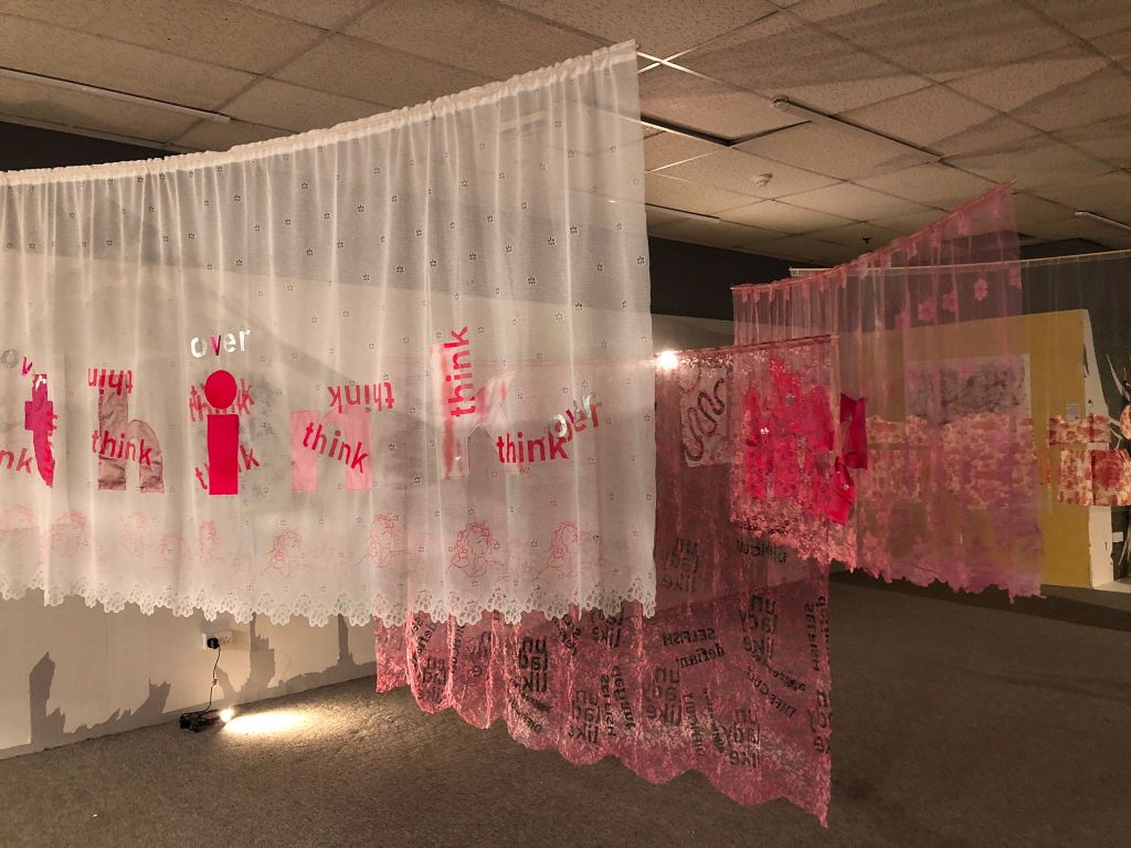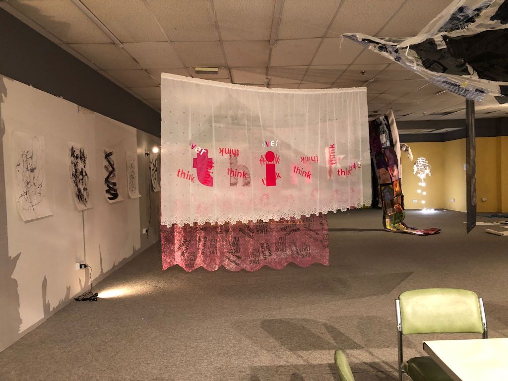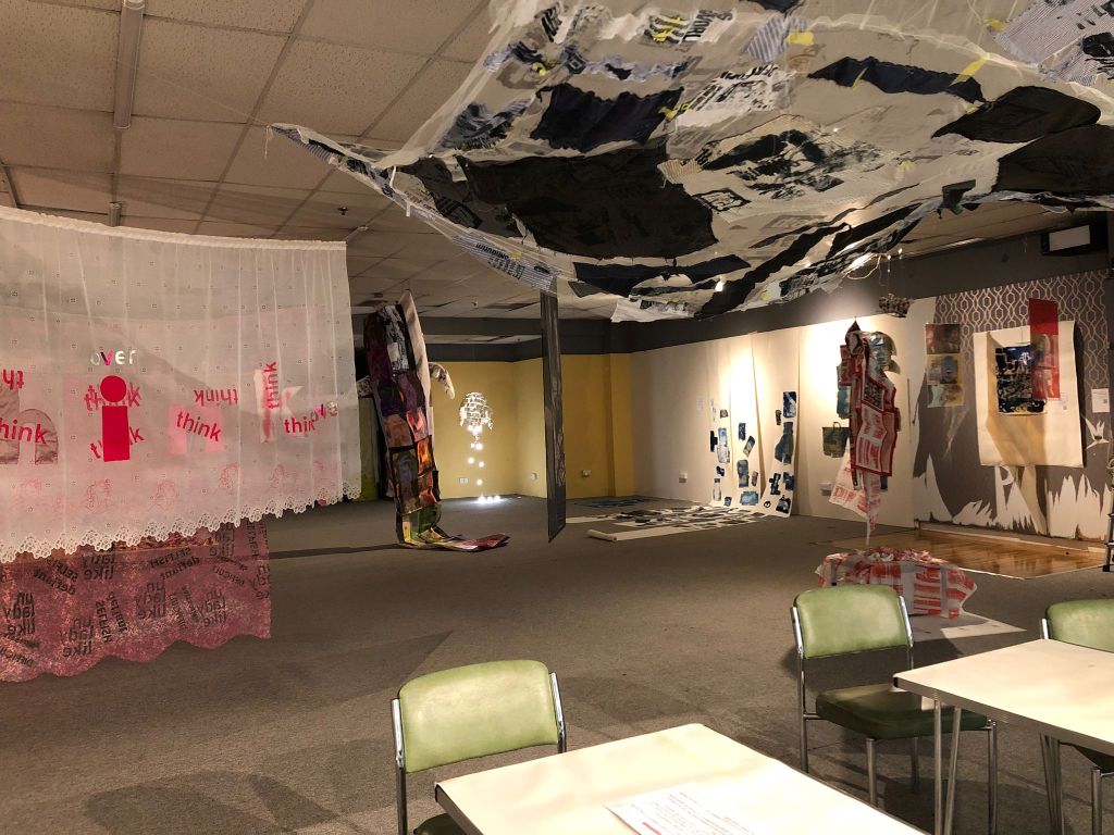 On the whole, it was a success. I exhibited one piece from the February exhibition, ‘Wear Shirt?’ hung in a different way – like a canopy rather than vertical. And a new piece, ‘Behind the Curtain’ featured four screenprinted and appliqued net curtains, with words and images in mainly pink and white. I loved how my pieces interacted with others in the space – especially the black and white drawings behind. And children found the curtains really fun – they ran through and underneath them, and I think its important to make art which is resilient to be played with and touched.