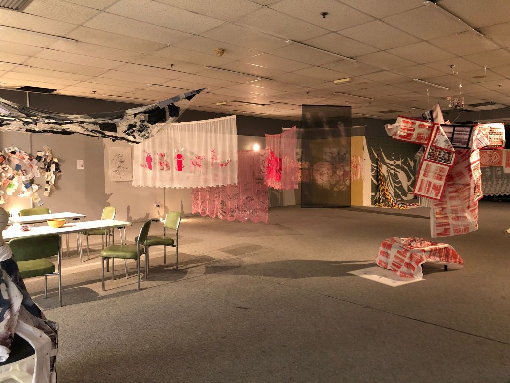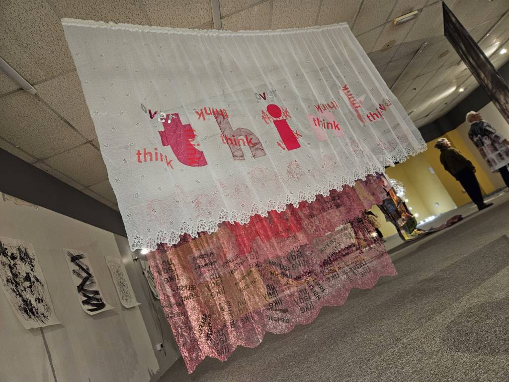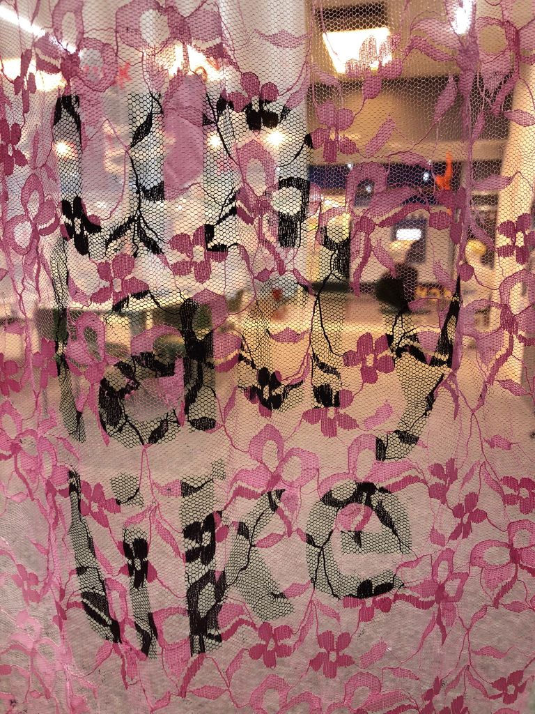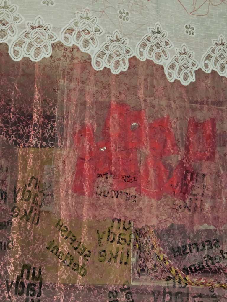 On the whole, it was a success. I exhibited one piece from the February exhibition, ‘Wear Shirt?’ hung in a different way – like a canopy rather than vertical. And a new piece, ‘Behind the Curtain’ featured four screenprinted and appliqued net curtains, with words and images in mainly pink and white. I loved how my pieces interacted with others in the space – especially the black and white drawings behind. And children found the curtains really fun – they ran through and underneath them, and I think its important to make art which is resilient to be played with and touched.
