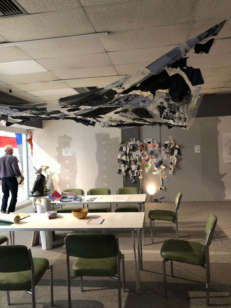 This was such a useful experience. We had searched high and low for an affordable space for our exhibition, and one of our members used his contacts in the commercial property industry to secure a vacant space in a bustling shopping centre on the outskirts of coastal town Eastbourne. Opposite a large supermarket, the space featured strip lights and garish wallpaper, but lots of room for our print sculptures.