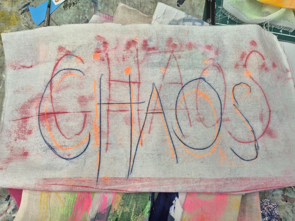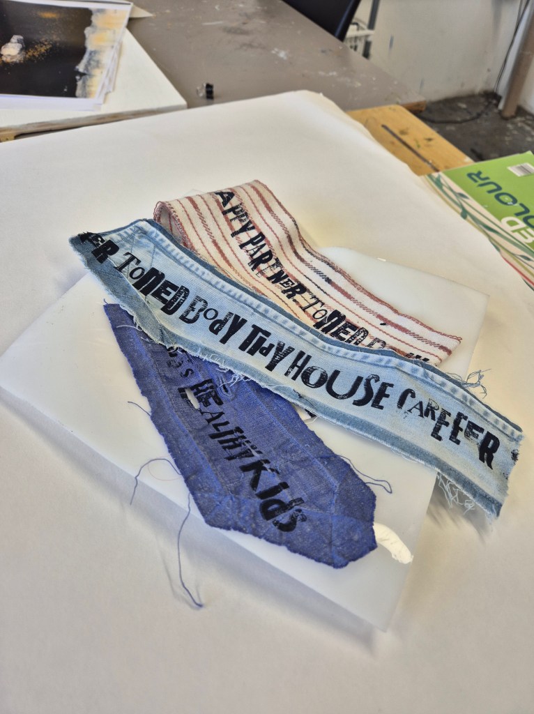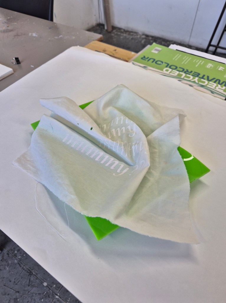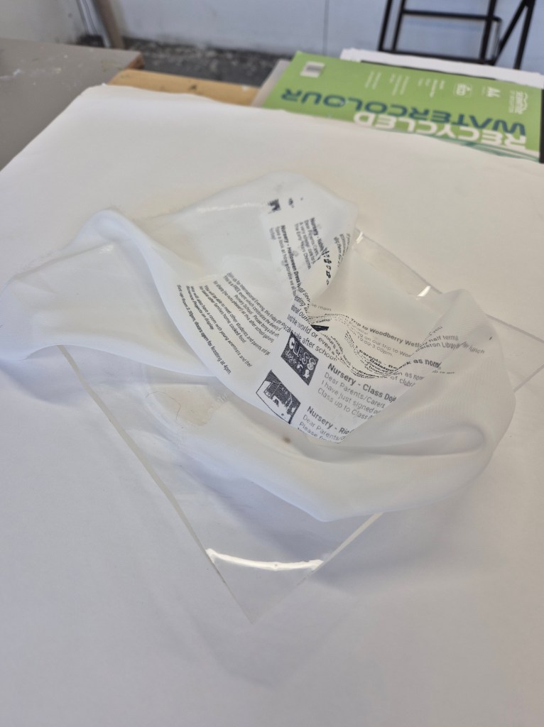 2. ‘Spinning’ plates with napkins – these plates are made from waste bits of acrylic, as I experimented with shaping them around a ceramic plate. I also tried some vacuum forming, but honestly just ended up making a plastic plate that just looks like it came from the pound shop! I really like the slightly folded nature of these ‘bowls’, I am going to see if I can make some more and also cut out the plate shap. The fabric is screenprinted with a range of things which make up the mental load for mothers. I want to experiment more with foiling, and some embroidery here.