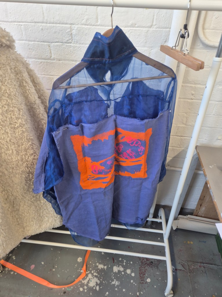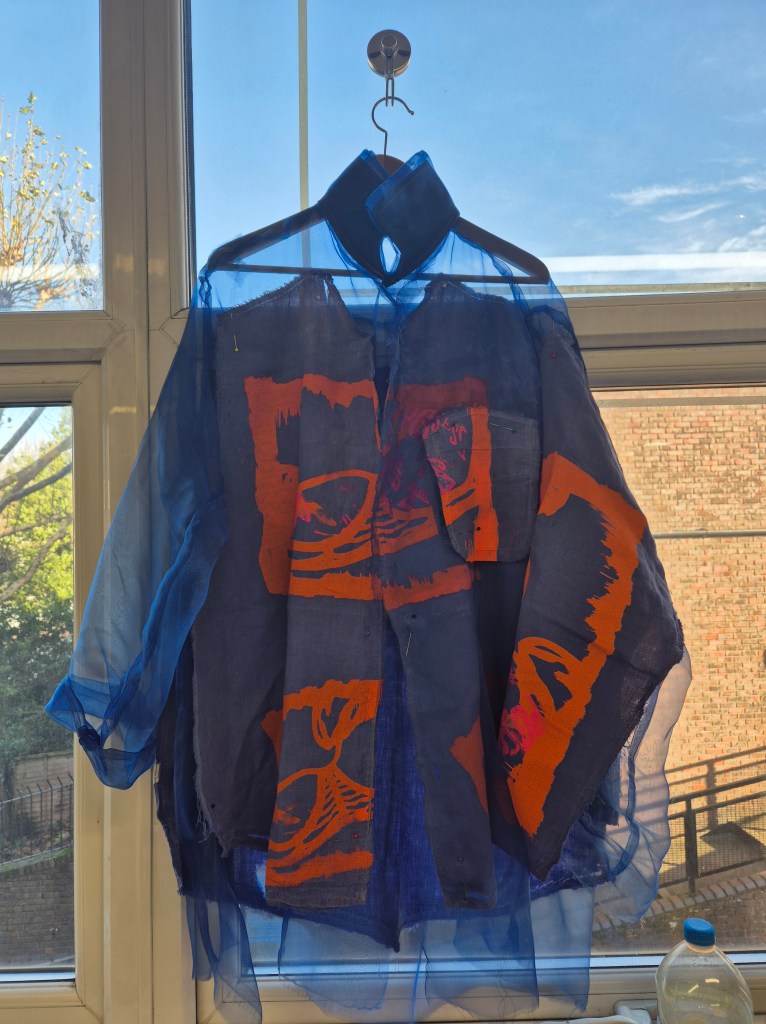 3. Poise shirt. Not sure where this one will end up – it started with a shirt that I took apart and printed a bra motif on. I like the contrast of the ‘masculine’ shirt and ‘feminine’ bra, as well as the clashing colours. It deals with the need for women to appear attractive and pliable for their partners in a heterosexual relationship, ‘taking apart’ these notions and rebuilding them. Is the shirt for women or for men? Is it hiding or revealing? I want to embroider on these also.