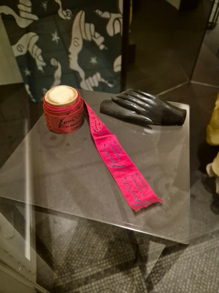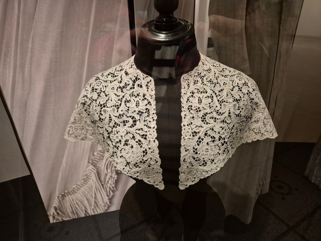 Next to it are some items from the costume section, an embroidered ribbon, some decorative hands and a delicate lace collar. I am drawn to the handmade here, and I am also very interested in collars as both a thing of decoration but also of constriction/covering up.