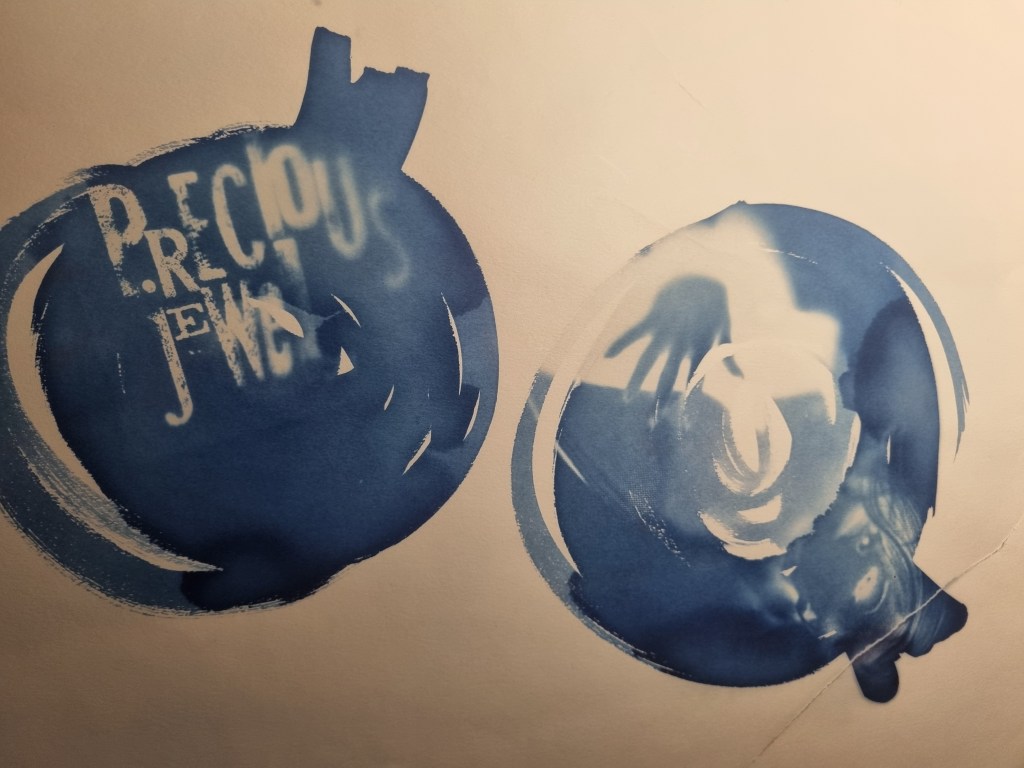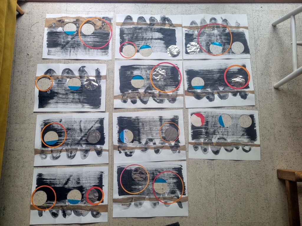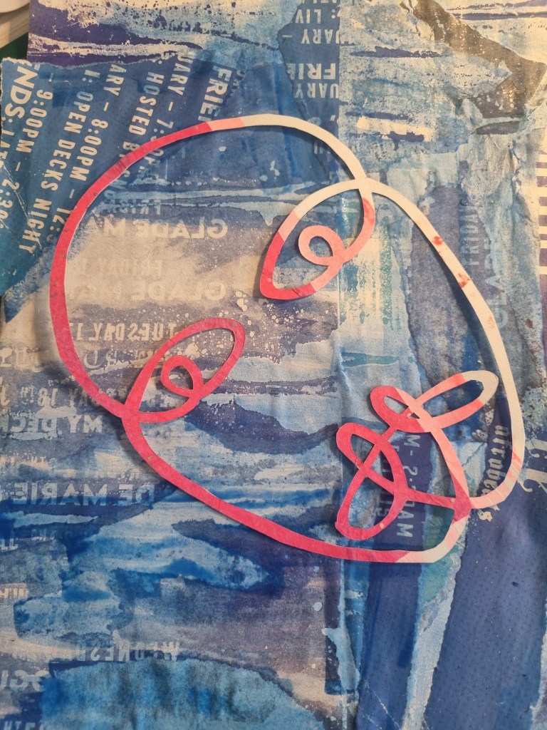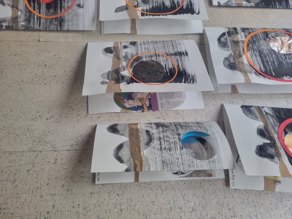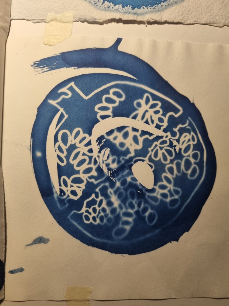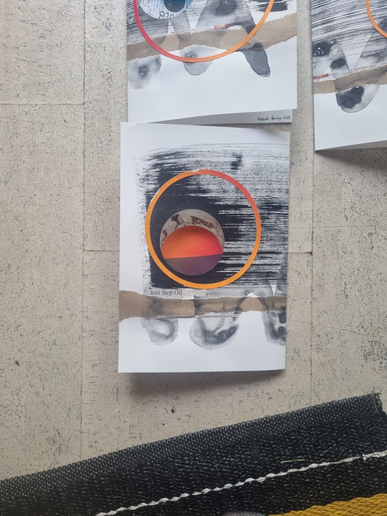 ‘Seeds’, 2024 (Cyanotype, cotton, wool, rice)‘Water scratch’ edition of 13, ink, collage, 2023‘Spiral’ card and paint 2023Sketchbooking, 2024‘Why so po-faced?’ card and paper, 2024‘Shipshape and Bristol fashion’ Tabard top, screenprinted and hand embroidered, 2014